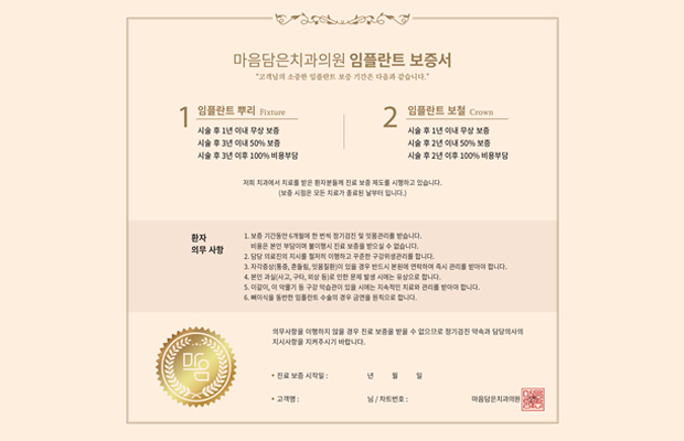 임플란트 진료 보증 시스템은 저희 의료진이 환자분께 드리는 약속이자, 최고의 진료 품질에 대한 강한 자신감의 표현입니다. 여러분의 건강한 미소, 저희가 끝까지 함께하겠습니다.